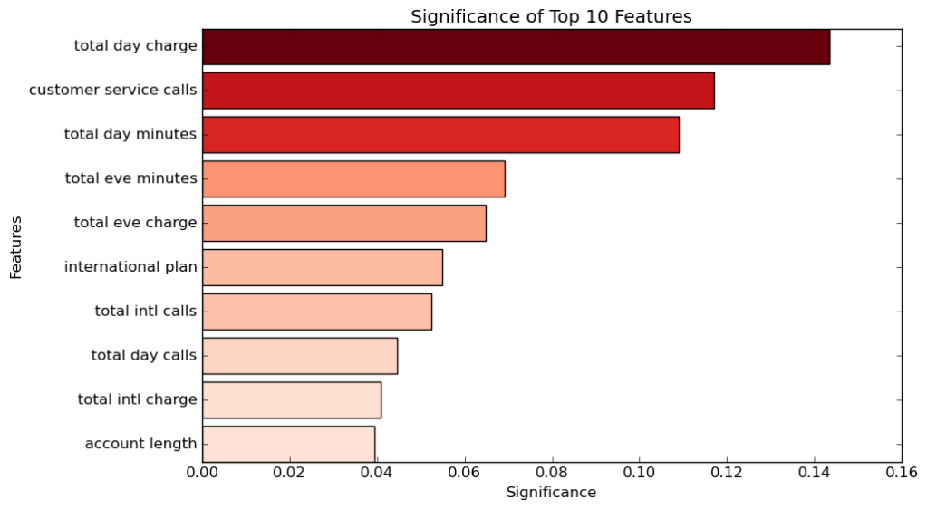 As we can see from the graph, we have the Top 10 Features in terms of their significance on predicting whether or not a customer will churn. Of these features, the Top 3 stand above the rest in their significance: