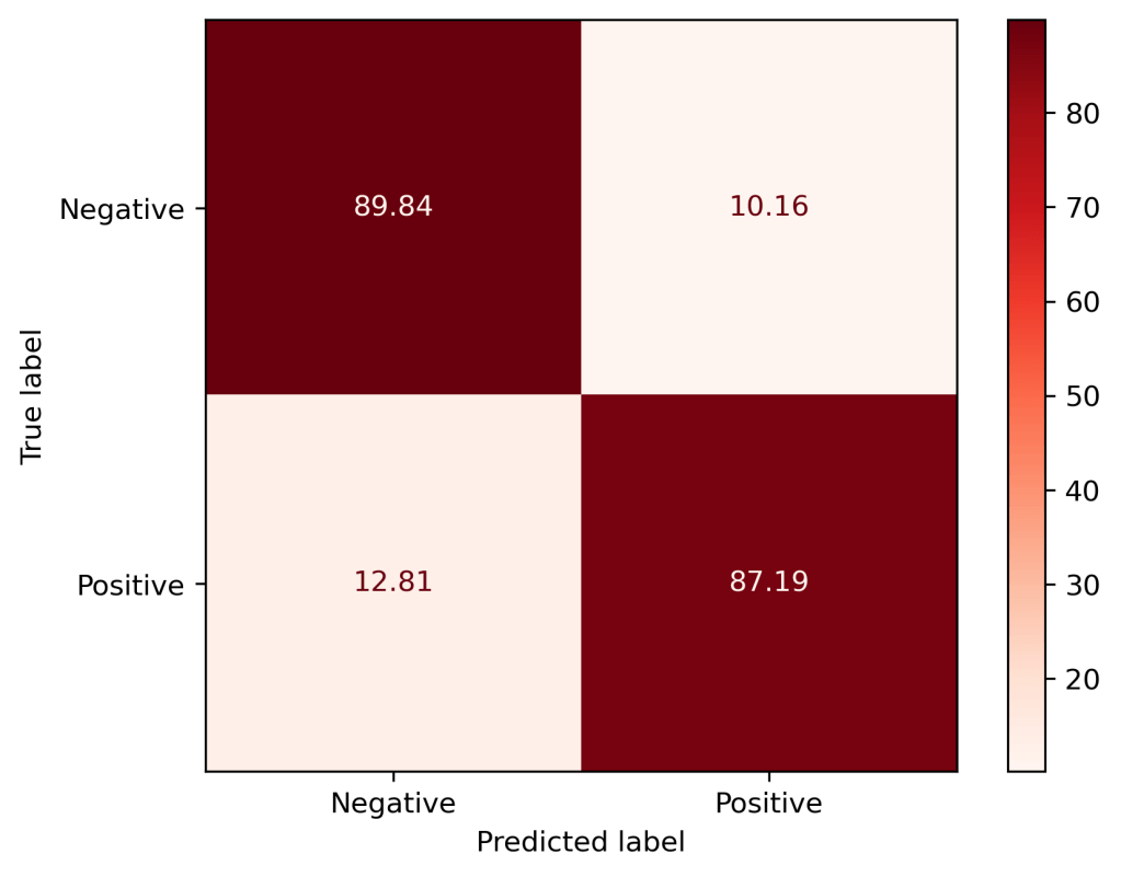 The top right corner shows that 10% of the negative reviews were incorrectly labeled as Positive, and 13% of the Positive reviews were incorrectly labeled as Negative.