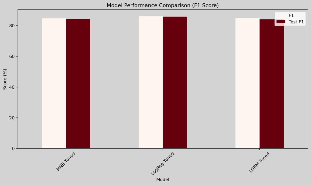 We can see above more strikingly that all our models performed well, with the tuned LogReg model performing the best with an 86% F1-Score on the testing data.